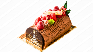 しっとりショコラスポンジに苺とクリームを巻き込み、切り株のように仕上げた伝統のクリスマスケーキ。