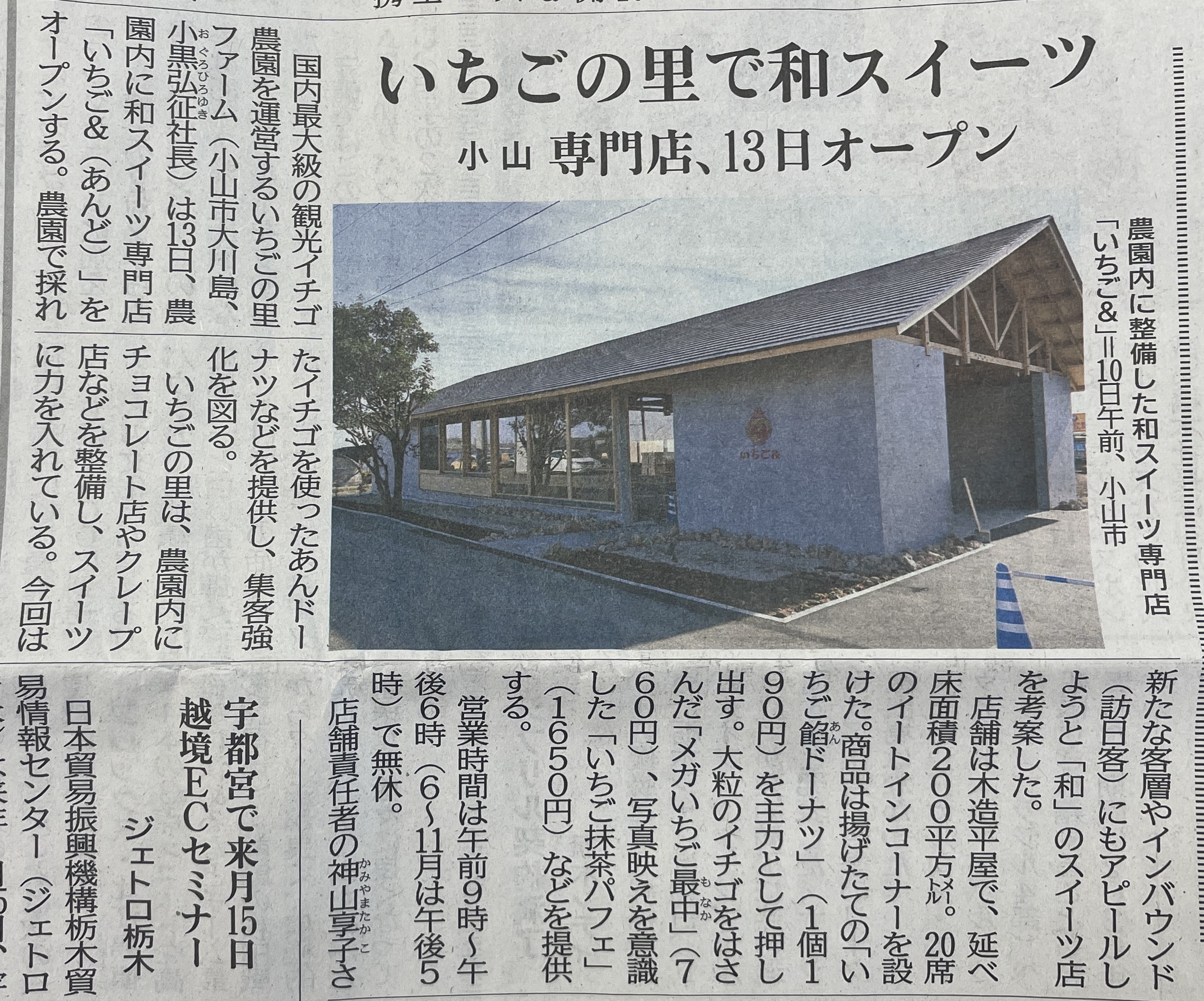 ~下野新聞(2025年12月11日掲載)~ 2025.12.14 2025年12月11日付の下野新聞にて、 いちごの里の新店舗 「いちご&(いちごアンド)」 についての記事が掲載されました。 新たにオープンした店舗のコンセプトや、いちごの里が手がける新ブランドとしての取り組みをご紹介いただいております。 今後も、より多くの方にいちごの里の魅力をお届けできるよう努めてまいります。 掲載媒体:下野新聞 掲載日:2025年12月11日